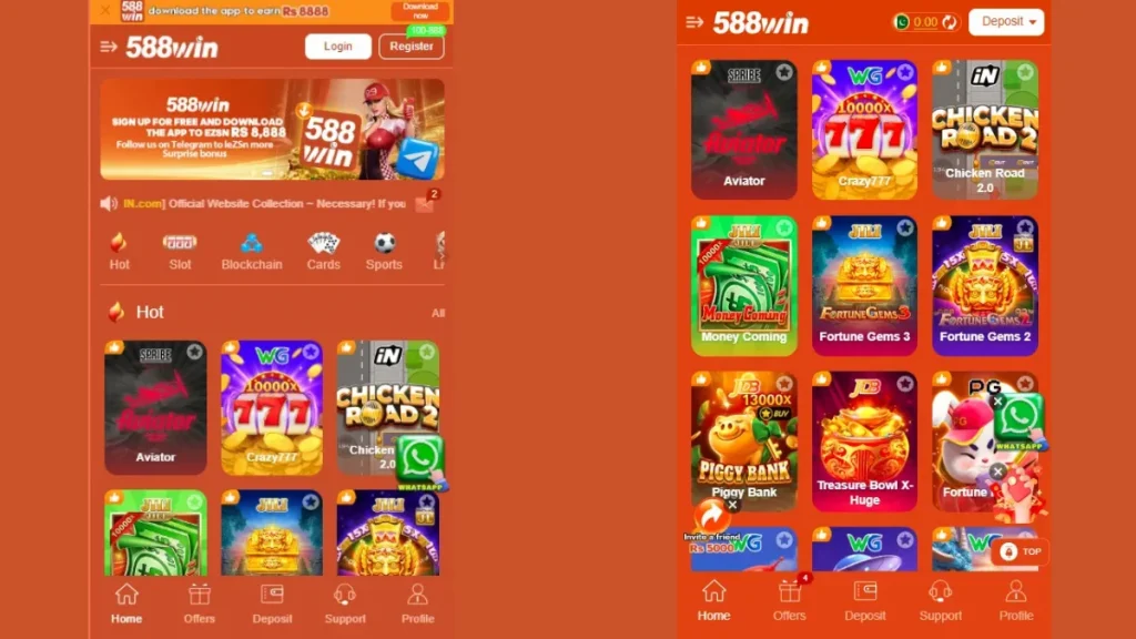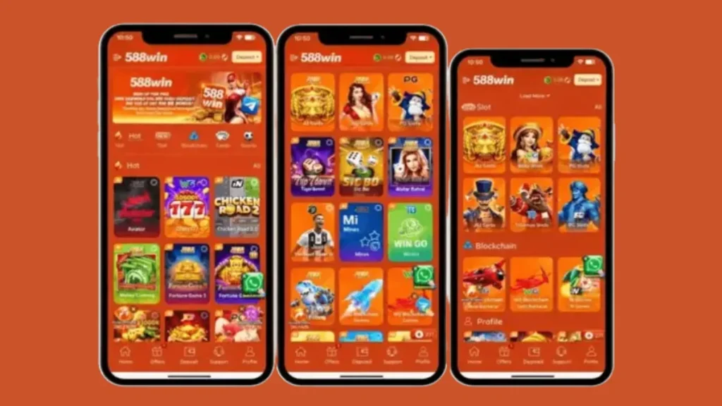 588 Win Game App works as a multi game mobile application. The platform brings different game types into one interface. Users open the app and view a dashboard with game icons arranged in categories.
