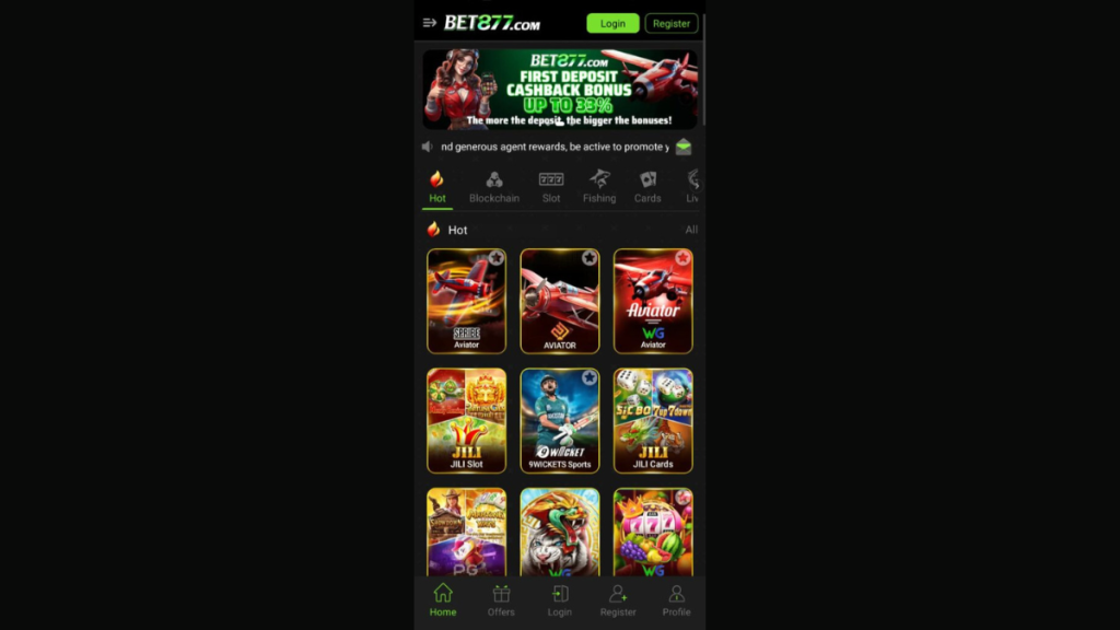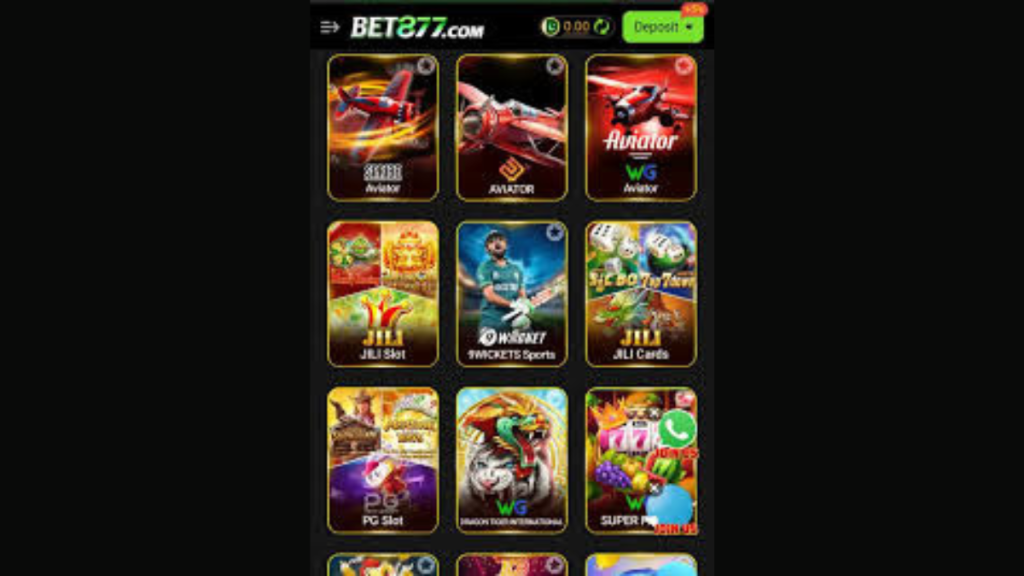 Bet877 Game App works as a multi game mobile platform. The application hosts several digital games inside a single interface. Users open the app and see a home dashboard where game icons appear in categories.