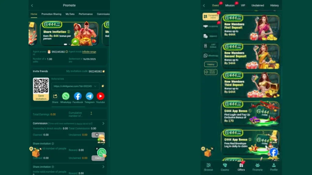 C444 Game operates as a mobile gaming platform where multiple digital games appear inside one Android application. Users install the APK file, register an account, and access a dashboard containing several game options.