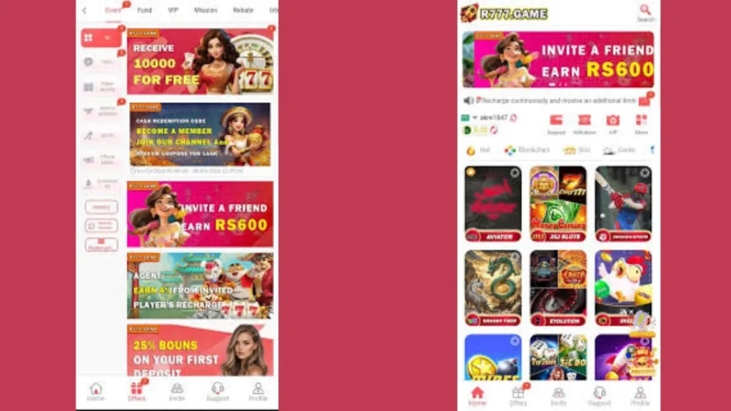 R777 Game runs as a standalone Android application. You download the APK file, install the app, and create an account. After login, you reach a home screen with game categories, wallet details, and promotional banners.